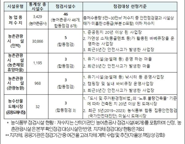 ‘대한민국 안전대(大)전환 집중안전점검’은 ‘국민과 함께하는 더 안전한 대한민국’을 구현하기 위해 중앙행정기관, 지자체, 공공기관 및 국민들이 합동으로 실시하는 안전점검으로, 농식품부 점검 대상은 농업용 저수지, 농촌관광시설, 농수산물 도매시장이다.