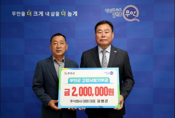 전남 무안군은 8일 주식회사 대원 김병곤 대표가 고향사랑기부금 200만원을 기탁했다고 밝혔다.
