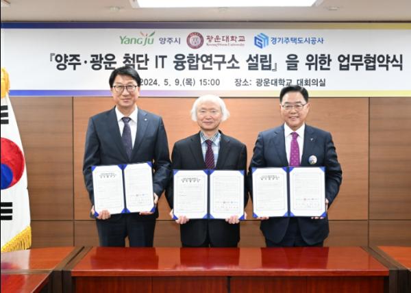 양주시는 9일 광운대학교, 경기주택도시공사와 양주테크노밸리 활성화를 위한 ‘양주·광운 첨단IT융합연구소(가칭) 설립 양해각서(MOU)’를 체결했다.
