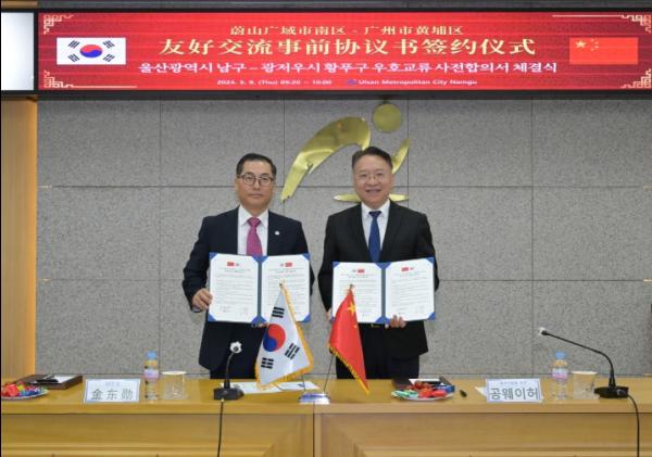 울산 남구는 9일 남구청 3층 회의실에서 중국 광저우시 황푸구(구장 시엔인쏭)와 우호교류 협약에 앞서 사전합의서 체결식을 가졌다.