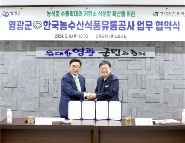 영광군은 지난 9일 한국농수산식품유통공사와 농수산식품 수출확대와 저탄소 식생활 확산을 위한 업무협약(MOU)을 체결했다.