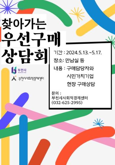 부천시는 오는 5월 13일부터 4일간 시민가치기업 판로개척을 위해 부서별로 ‘찾아가는 우선구매 상담회’를 개최한다.