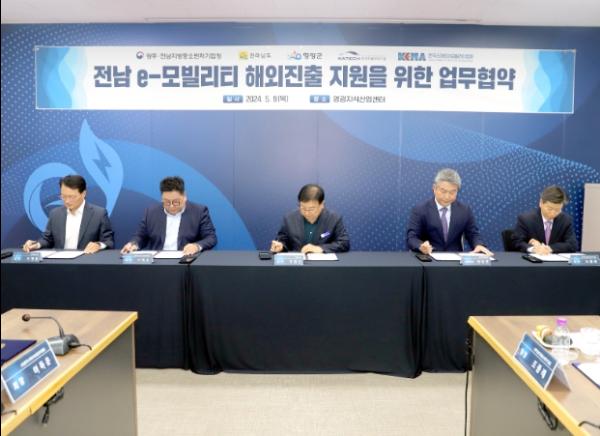 영광군은 9일, 15시에 영광 지식산업센터에서 광주·전남지방중소벤처기업청, 전라남도, 영광군, 한국자동차연구원 전남본부, 한국스마트이모빌리티협회 등 5개 기관이 전남 e-모빌리티 해외진출 지원을 위한 업무협약을 체결했다고 밝혔다.