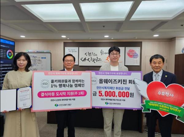 천안시는 10일 올웨이즈키친(주)가 ‘걷쥬 기부챌린지’참여 약정서를 전달했다고 밝혔다.