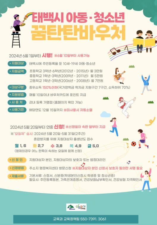 태백시는 오는 5월 20일부터 행정복지센터를 통해 태백시 아동·청소년 지원을 위한 꿈탄탄바우처 지원사업의 신청접수를 시작한다고 밝혔다.