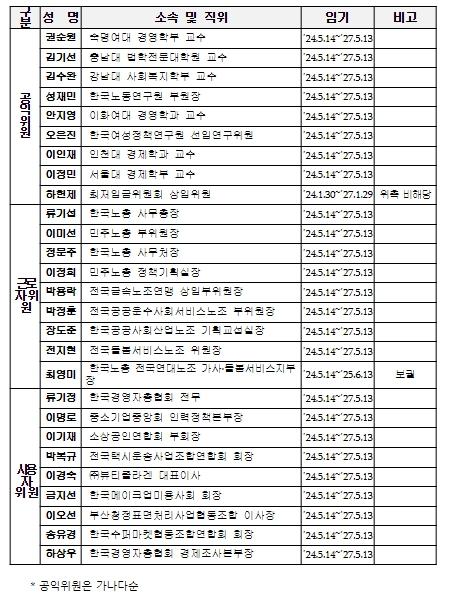 이번 위촉은 위원 27명(공익위원·근로자위원·사용자위원 각 9명) 중 5월 13일로 3년간의 임기가 만료되는 25명(공익위원 8명, 근로자위원 8명, 사용자위원 9명)과, 보궐위원 1명(근로자위원)이 대상이다.