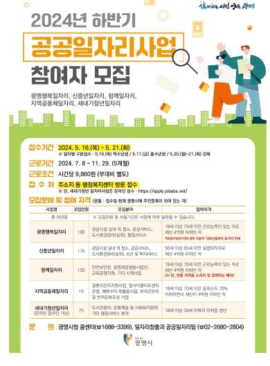 광명시는 취업 취약계층의 한시적 일자리 제공과 최저생활 보장을 돕기 위해 5월 16일부터 21일까지 ‘2024년 하반기 공공일자리사업’ 참여자 550명을 모집한다.