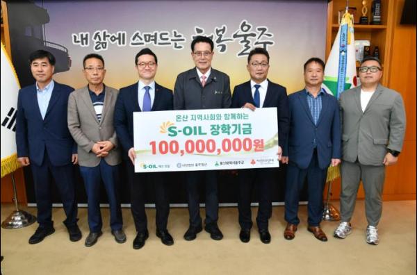 S-OIL(주)이 13일 울주군청 군수실에서 이순걸 군수와 S-OIL(주) 김태기 생산운영본부장, (사)울주청년 윤태양 이사, 울산사회복지공동모금회 양호영 사무처장, 온산읍 대표 단체장 등이 참석한 가운데 장학기금 1억원을 전달했다.