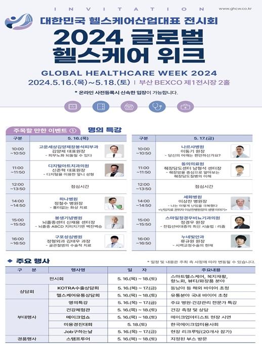 부산시는 오는 16일부터 18일까지 벡스코 제1전시장에서 '2024 글로벌 헬스케어 위크'를 개최한다고 밝혔다.