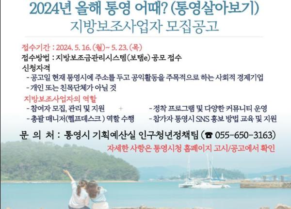 2024년 올해 통영 어때?(통영 살아보기)사업은 관외거주자가 통영시에 생활하는데 필요한 매니저 지원형 사업으로 지방보조사업자의 역할은 참여자 모집·관리 및 지원, 총괄 매니저(헬프데스크)역할 수행, 원룸 구입 지원 정착 프로그램 및 다양한 커뮤니티 운영 등이다.