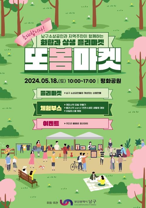 부산 남구는 오는 5월 18일, 남구 소상공인 홍보장터(또봄마켓)를 개최한다. 소상공인 영업이익 증대와 내수 활력 제고를 위해 기획된 이번 행사는 오전 10시부터 오후 5시까지 남구 평화공원 산책로 일원에서 진행된다.