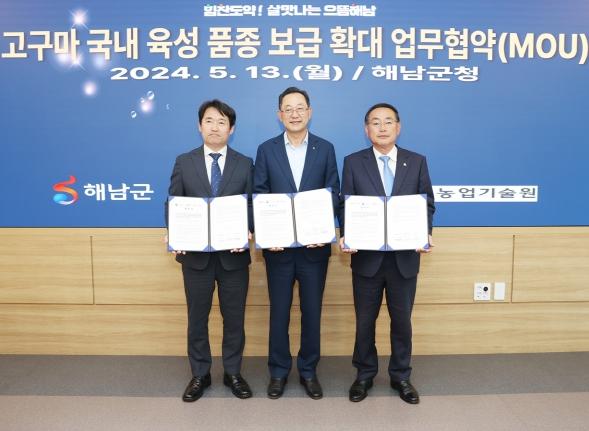 명현관 해남군수와 국립식량과학원 곽도연 원장, 전라남도농업기술원 박홍재 원장, 각 기관 관계자들이 참석한 가운데 열린 업무협약식에서는 해남고구마의 품질 경쟁력 향상을 위해 고구마 신품종의 품종 육성과 재배기술 개발 등에 유기적 협력체계를 구축해 나가기로 했다.