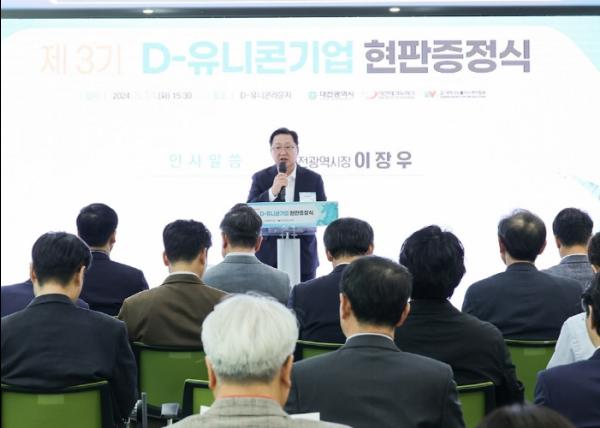 이장우 대전시장은 "D-유니콘프로젝트는 대전시가 보유한 첨단과학기술과 우수인력을 활용한 지역기업의 성장에 큰 역할을 담당하고 있다?라면서 “오는 7월 전국 최초 공공투자기관인 대전투자금융(주) 설립을 통해 유망 기술기업의 성장을 적극 지원하겠다”라고 말했다.