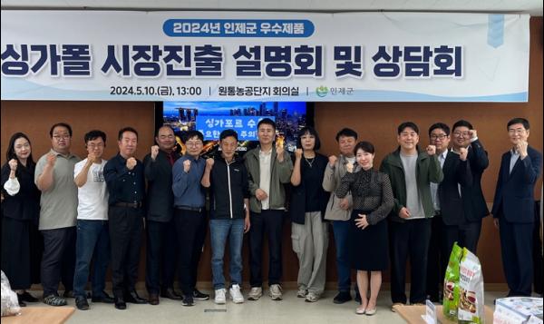 인제군이 최근(5월 10일) 원통농공단지 대회의실에서 지역 식품 제조 기업들을 대상으로 ‘2024년 인제군 우수제품 싱가포르 시장 진출 설명회 및 상담회’ 개최했다.