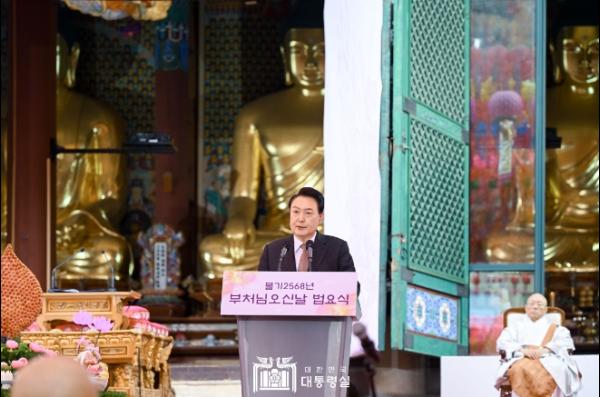 윤석열 대통령은 5월 15일 오전 조계사 대웅전 앞 특설법단에서 열린 '불기 2568년 부처님오신날 봉축 법요식'에 참석했다. 오늘 행사는 대한불교조계종이 주관했으며, 올해의 봉축표어는 "마음의 평화, 행복한 세상"이다.