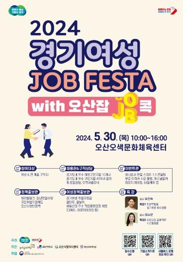 경기도와 경기도일자리재단은 오산시와 협력하여 5월 30일 오산시 오산오색문화체육센터에서 ‘2024년 경기여성잡페스타 with 오산잡(JOB)콕’ 취업박람회를 개최한다.