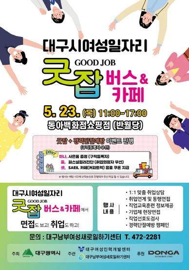 대구광역시는 취업을 희망하는 경력단절 및 미취업 여성을 위해 ?찾아가는 취업상담 서비스 ‘굿잡(Good Job) 버스’'를 오는 5월 23일 오전 11시부터 동아백화점 쇼핑점(반월당역 15, 16, 17번 출구)에서 운영한다.
