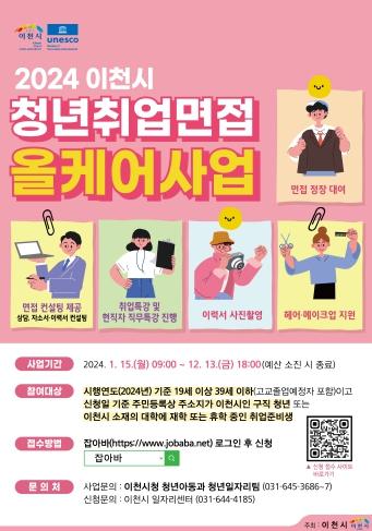 '이천시 청년취업면접 올케어사업'은 취업특강을 비롯하여 면접 컨설팅, 면접 정장 대여, 헤어·메이크업, 이력서 사진 무료 촬영·인화 등을 지원한다.