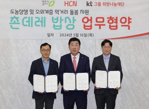 16일 임시청사 직지실에서 열린 협약식에는 이범석 청주시장, 원흥재 HCN 대표이사, 손희수 KT희망나눔재단 사무처장 등이 참석했다.
