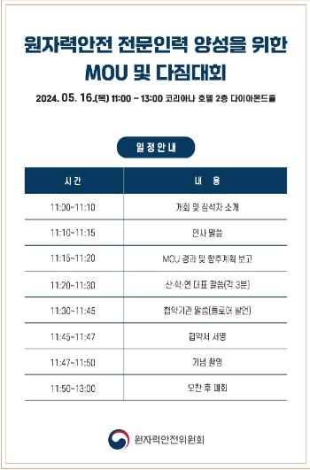 원안위는 16일 11시 서울 중구 코리아나호텔에서 원자력 기업 대표, 공대 학장, 연구기관장 등과 ‘원자력안전 전문인력 양성을 위한 협약(MOU) 체결 및 다짐대회’를 개최했다. 협약(MOU) 체결에는 원안위를 포함하여 총 39개 기관이 서명했다.