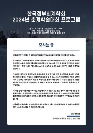행정안전부는 한국정부회계학회, 한국지방재정공제회와 함께 5월 17일 오후, 가천대학교에서 ?한국정부회계학회 2024년 춘계 학술대회?를 개최한다고 밝혔다.