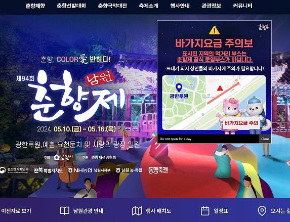 여기에 제전위는 최근 축제 홈페이지를 통해 문제가 됐던 점포 관련 ‘바가지요금 주의보’팝업창을 띄우며‘표시된 지역의 먹거리 부스는 춘향제 공식 운영부스가 아니’라고 공지, 뜨내기 외지 상인들의 바가지에 주의가 필요하다’고 계도했다.