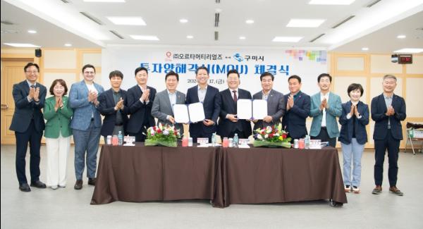 구미시는 17일 시청에서 ㈜오르타머티리얼즈 윤형석 대표, 김장호 구미시장, 안주찬 시의회 의장, 경제 단체장들이 참석한 가운데 ㈜오르타머티리얼즈와 투자양해각서(MOU)를 체결했다.