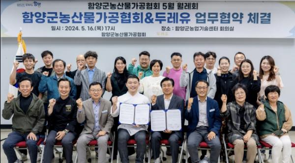 함양군 농산물가공협회는 5월 16일 농업기술센터 회의실에서 ㈜두레유 유현수 대표와 함양군 먹거리산업 활성화를 위한 업무협약을 체결했다.