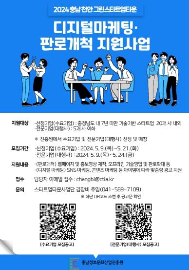 충남정보문화산업진흥원은『2024년 충남 천안 그린스타트업타운 디지털마케팅·판로개척 지원사업』에 참여할 수요기업을 모집한다.