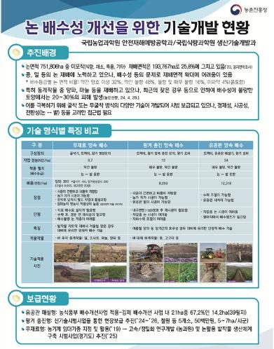‘무굴착(유공관) 땅속 배수 기술’은 재료비, 공사비 등이 들어가나 여름철 장마 등 장기간 집중호우에도 배수성과 내구성이 우수해 콩, 고구마 등 벼 대체 하계작물 재배에 적합한 기술이다.
