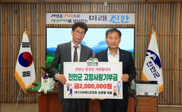㈜가산애드포인트 손종필 대표는 20일 진안군 군수실에서 지난해 500만원에 이어 올해 고향사랑기부금 200만원 기탁식을 가졌다.