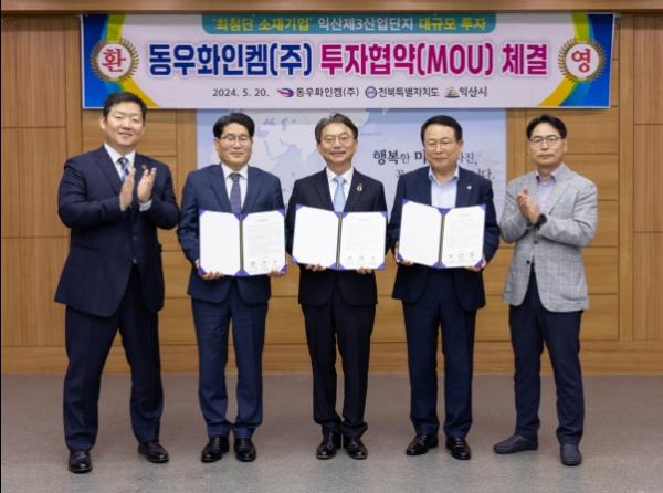 전북특별자치도와 익산시는 20일 익산시청 상황실에서 정헌율 익산시장과 천세창 전북특별자치도 기업유치지원실장, 이종찬 동우화인켐㈜ 대표이사 등이 참석한 가운데 익산제3일반산단 내 대규모 투자를 위한 투자협약(MOU)을 체결했다고 밝혔다.