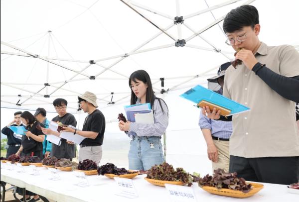 이날 평가회에선 기존 재배 품종인 ‘선풍골드’, ‘진청’ 대비 고온기 시설재배에서 적색 발현이 떨어지는 문제점을 개선한 ‘참흑치마’와 아삭한 식감이 좋은 ‘갈맷빛’이 농가의 관심을 모았다.