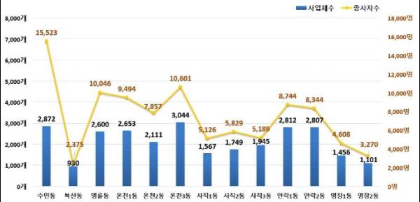 부산 동래구는 구민들에게 통계 정보를 제공하고, 소상공인이나 창업자들에게 경제활동에 필요한 기초자료를 제공하기 위해 인구와 사업체 통계조사 결과를 분석하여 빅데이터화한 '사업지원정보'를 매년 구 홈페이지를 통해 제공하고 있다.
