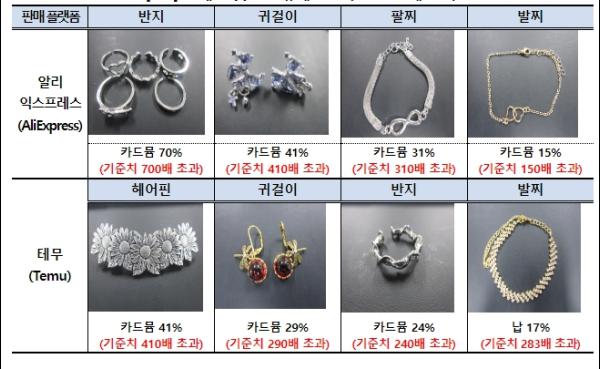 장신구 종류별로 살펴보면 귀걸이 37%(47점 검출), 반지 32%(23점 검출), 발찌 20%(8점 검출) 순이며, 플랫폼별로는 알리익스프레스 27%(180점 중 48점 검출), 테무 20%(224점 중 48점 검출)이다.