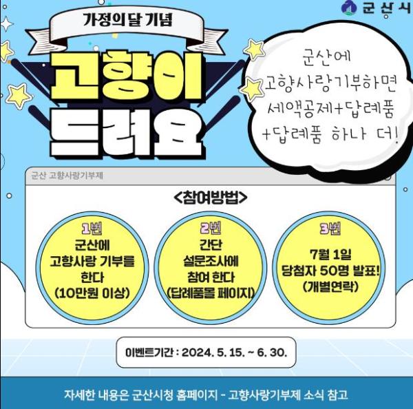 군산시가 오는 6월 30일까지 고향사랑 기부 특별 이벤트를 진행한다. 이번 이벤트는 가정의 달을 맞이하여 고향사랑기부제를 활성화하기 위해 마련됐다.