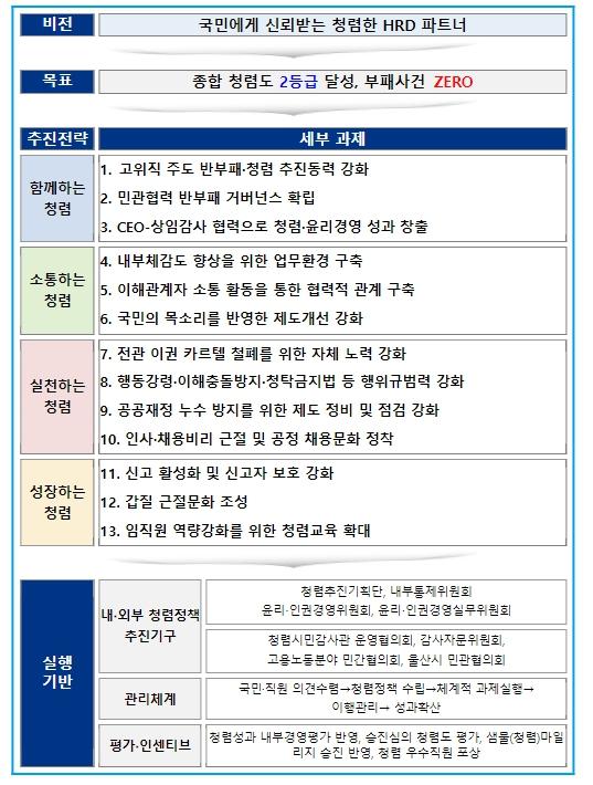 이우영 이사장은 “강도 높은 부패 근절과 조직문화 혁신을 통해 국민의 눈높이에 맞는 청렴한 인적자원개발 전문기관으로 거듭나겠다”라고 말했다.