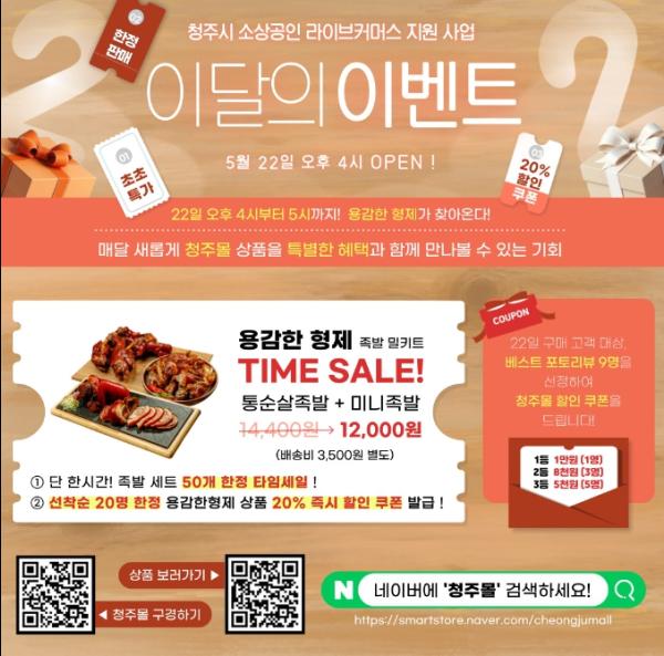 청주시는 ‘청주몰’(네이버 스마트스토어) 활성화와 입점 소상공인의 상품 홍보를 위해 추진하는 ‘이달의 이벤트’를 오는 22일부터 새롭게 운영한다고 밝혔다.