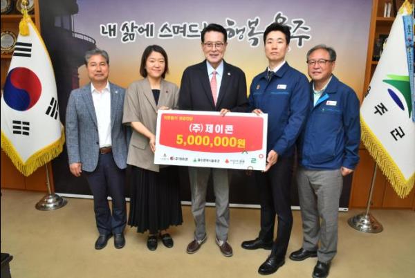 ㈜제이콘이 21일 군청 소회의실에서 이순걸 군수, (주)제이콘 홍대성 대표이사, 울산 사회복지공동모금회 이원경 모금사업팀장 등 관계자들이 참석한 가운데 울주군 저소득세대를 위한 성금 500만원을 전달했다.