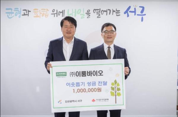 인천 서구는 지난 21일, ㈜이룸바이오(대표 고귀순, 조진형)로부터 이웃돕기 성금 100만원을 전달받았다고 밝혔다.