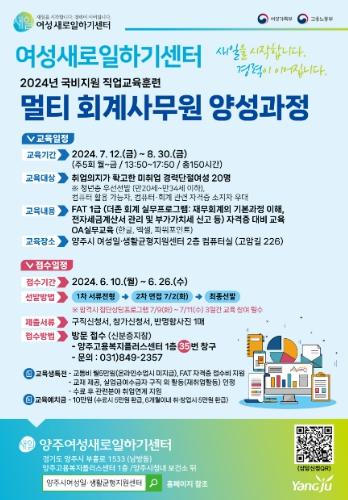 양주시가 양주여성새로일하기센터에서 오는 6월 10일부터 6월 26일까지 경리, 회계, 사무 분야로 취업을 희망하는 여성을 대상으로 직업교육훈련 ‘2024년 멀티 회계사무원 양성 과정’에 참여할 수강생을 모집한다고 22일 밝혔다.