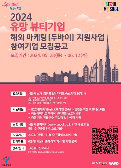 서울시는 5월 23일부터 6월 12일까지 경쟁력 있는 서울 유망 중소 뷰티기업 30개 사를 모집해 UAE 두바이에 ‘K-뷰티 팝업스토어’를 열고 온·오프라인 유통망 입점까지 지원한다.