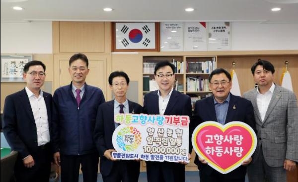 하동군은 22일 양산농협 임직원들이 하동군의 발전을 기원하며 지난해에 이어 올해도 고향사랑기부금 1천만 원을 전달했다고 밝혔다.
