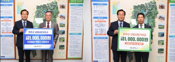 완주군 출신인 박현수 인천일보 대표이사와 박노성 ㈜성경종합건설 회장이 완주군에 고향사랑기부금 각 100만 원을 전달했다.