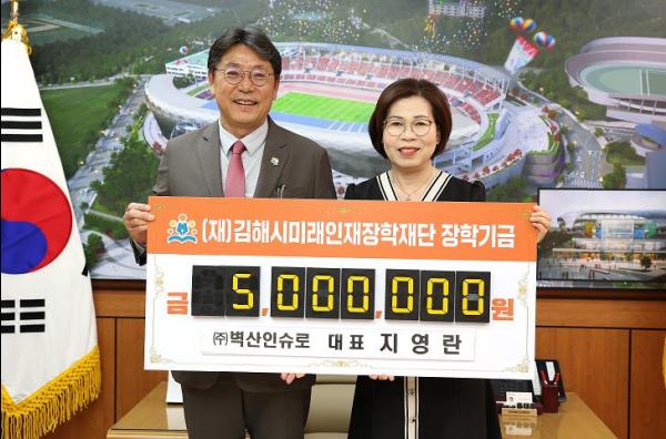 김해시미래인재장학재단은 22일 ㈜벽산인슈로에서 500만원을 기탁했다고 밝혔다.