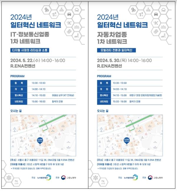 5월 22일과 5월 30일, R.ENA컨벤션(서울 중구)에서 진행되는 ?제1차 업종별 일터혁신 네트워크?는 정보기술(IT)·정보통신업종 35개 기업과 자동차업종 22개 기업이 참여한다. 이들은 네트워크를 통해 업계 이슈, 일터혁신 컨설팅 참여 경험 등을 공유하고, 일하기 좋은 회사를 만드는 방안을 함께 나눌 예정이다.