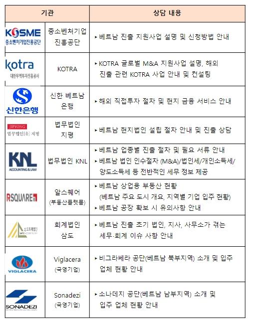 중소벤처기업진흥공단, 코트라 등 해외진출을 지원하는 공공기관과 신한은행을 포함한 법무?회계법인 등 다양한 분야의 민간기관이 참여했으며, 기관별 전문성을 바탕으로 베트남 현지 시장?경제동향, 베트남 진출 관련 법률?회계?금융?투자 분야 정보제공 설명회와 기관별 부스를 통한 1:1 상담회가 진행됐다.