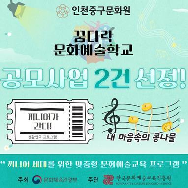 인천중구문화원은 문화체육관광부가 주최하고 한국문화예술교육진흥원이 주관하는 '2024 생애주기별 문화예술교육 지원사업 '꿈다락 문화예술학교''에 선정돼 국비 4,000만 원을 확보했다.