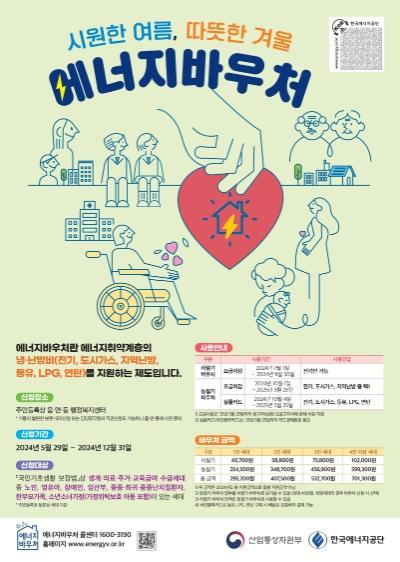 취약계층을 대상으로 에너지비용을 지원해주는 에너지바우처의 ’24년도 사업이 본격 시작된다. 산업통상자원부는 5월 29일부터 12월 31일까지 전국 읍·면·동 행정복지센터와 복지로 홈페이지에서 올해 사업의 신청·접수를 진행한다고 밝혔다.