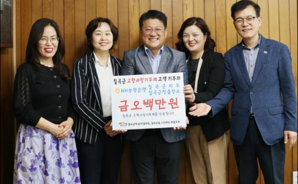 NH농협은행 칠곡군지부는 칠곡군 제1금고로서 군 재정을 관리하고 있으며, 군청출장소를 통해 각종 민원서비스를 제공해 오고 있는 가운데, 지부장과 직원들의 뜻을 모아 고향사랑기부금 500만원을 기탁하며 응원의 힘을 보탰다.